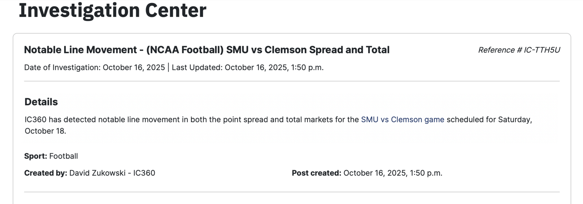 On Thursday, Oct. 16, Clemson officials received a “Notable Line Movement” notification from IC360 about the “SMU vs Clemson Spread and Total.”