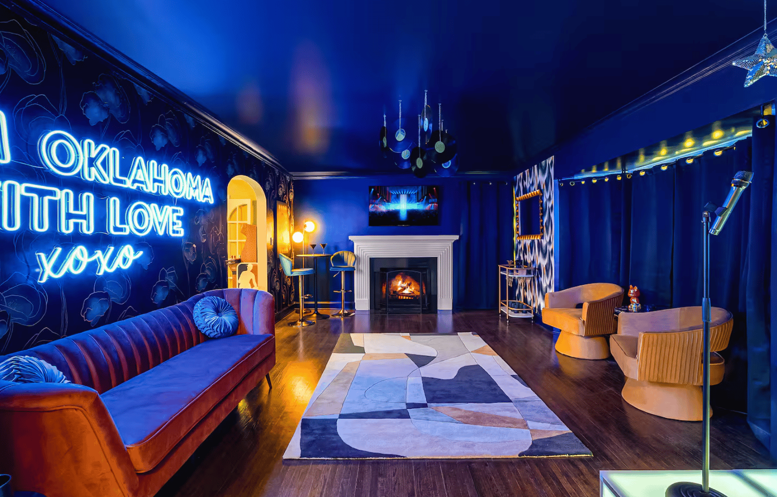 Jonathan: What I like most is when you walk in, you have the karaoke room, you have the fireplace, and then you have this big neon sign and wallpaper that says “From Oklahoma With Love.” I think it really encapsulates the entire design and the personality of the home.